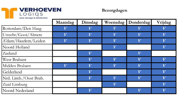 Wijnen uit voorraad kunnen binnen 48 uur worden geleverd. WDC Verhoeven WDC uit Tilburg, tel: 013-5942430, zal de wijnen bij u bezorgen. U kunt op onderstaand schema zien, wanneer ze bij u in de buurt zijn, in de randstad is dat bijvoorbeeld 5 dagen/week. U kunt hier een uitgebreid schema downloaden. Het is handig als u bij het versturen van uw bestelling aangeeft welke dag u het best uitkomt. Bezorging is gratis bij minimaal 36 flessen of € 350 per zending, anders wordt € 12,95 bezorgbijdrage in rekening gebracht. Let op dat een zending uit Baarn niet met een zending uit Tilburg gecombineerd kan worden!